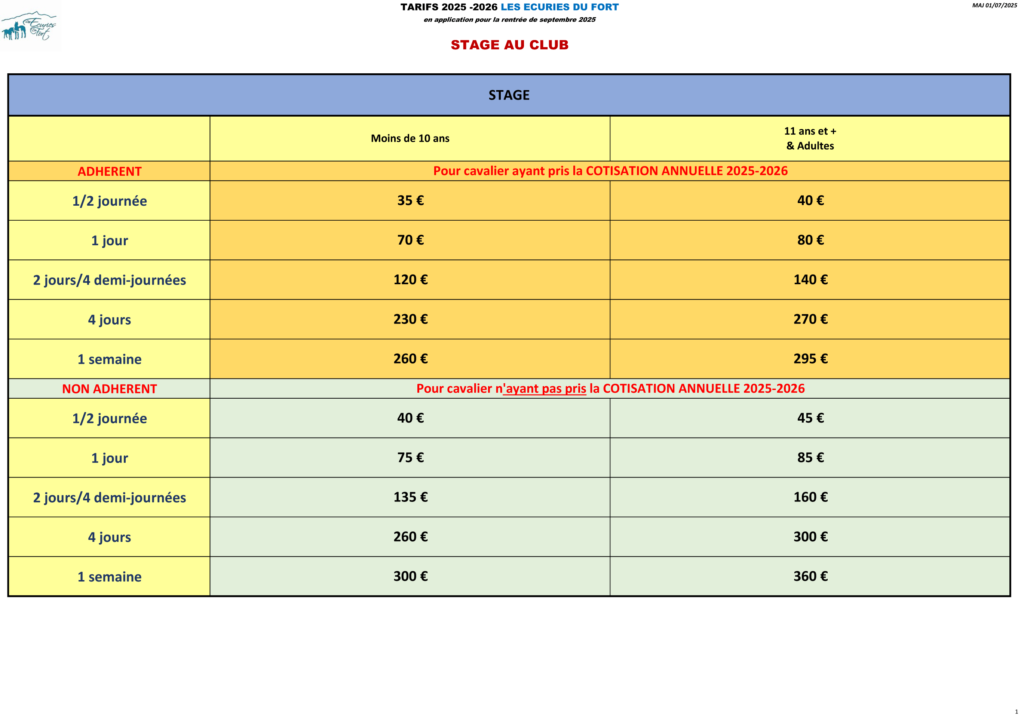Tarifs des stages