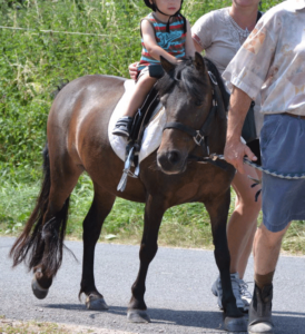 Nous vous confions un poney pour faire découvrir le poney à votre enfant. Sous la responsabilité d'un adulte. Il s'agit d'une découverte au pas, sur un sentier connu et fléché. le tour des pommiers 1/2 heure 12€. Le tour de la rivière (réservé aux enfants qui ont deja fait plusieurs fois les autres tours) ou le petit Villars 1h 18€. Nous rappelons que l'adulte doit avoir les pieds couverts (pas de tongs pas de sandales) et avoir eu une petite formation pour tenir le poney. 2 adultes sont nécessaire pour tenir les enfants de moins de 2ans 1/2. bombe obligatoire. Rappel : la bienveillance vis a vis des enfants et des poneys est obligatoire; il est interdit de taper le poney, de changer de cavalier, de faire monter 2 enfants sur le même poney, de faire trotter le poney ! |